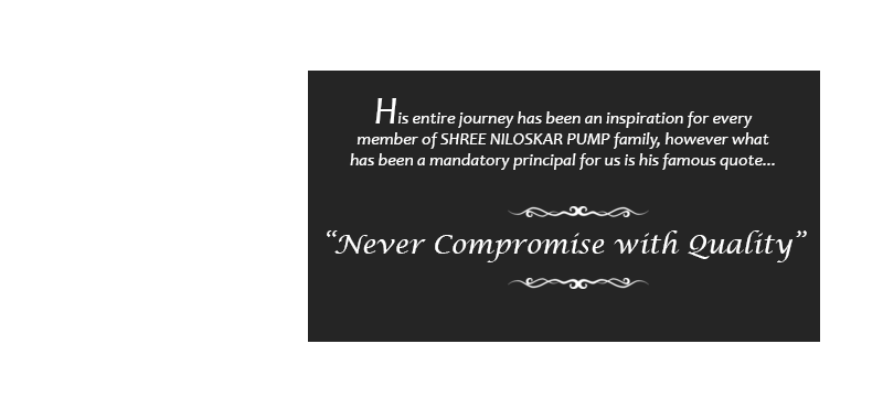 With a little less then a decades experience, he incepted SHREE NILOSKAR PUMPS at Ahmedabad, Gujarat INDIA. Those were the days when business meant trading and a very small fraction of people had a belief in manufacturing industry. Shri Chandubhai Panchal belonged to that small fraction. He was confident in his belief and he was equally confident in himself. This confidence was applauded by the strength and support he received from his family.